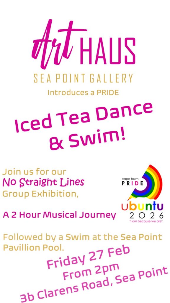 Come and take a look at the No Straight Lines Group Exhibition, before embarking on a 2 hour Musical Journey. Don’t forget your swimsuit as this event will be followed by a swim at Sea Point Pavilion Pool, a couple of hundred metres from the gallery.